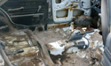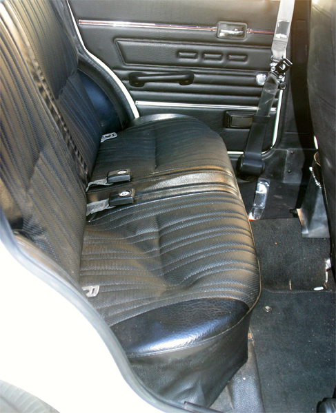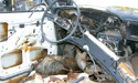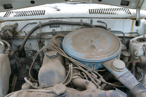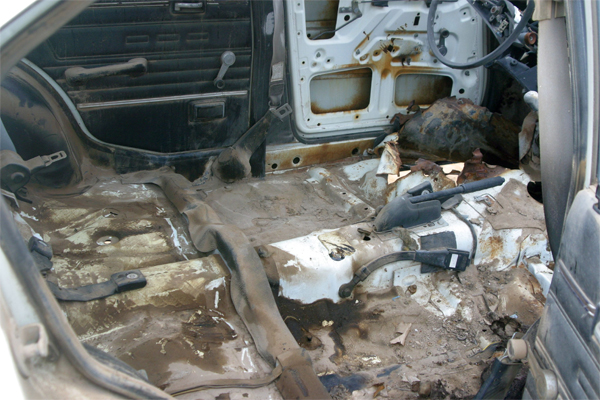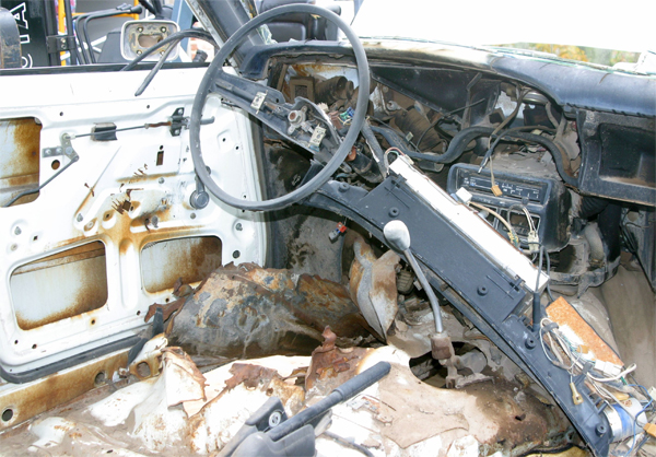 After being stored outside for 28 years on a police impound lot, the Datsun showed obvious signs of weathering and abandonment. The interior of the car had been disassembled by police investigators directly following the explosion and was never reinstalled. All of the components had been haphazardly stored inside the passenger compartment from that time forward. Much of the unpainted metal was covered in a thin layer of corrosion. The paint was severely oxidized and powdery, and every surface was covered in dust and debris. The shattered windshield continued to collapse into the interior, and the tires had deteriorated and gone flat. In addition to the damage caused by the initial crime and subsequent abandonment, desert wildlife had used some of the interior textiles for nesting, making the Datsun their home.
