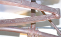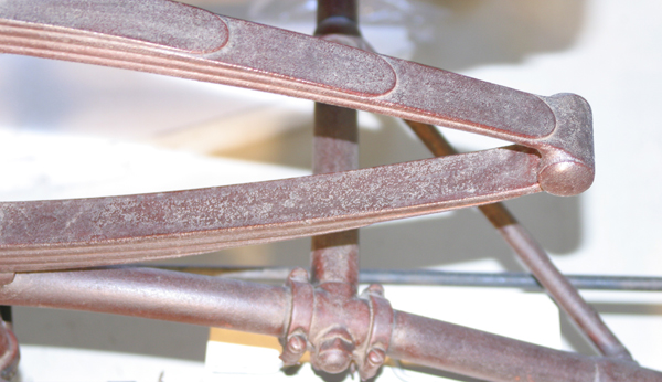 The automobile was in fair condition; however, considered unstable due to fractures of the Edison body modifications. The original body side panels and applied faux louvers were split along the grain of the wood causing misalignment. The tubular iron chassis and leaf springs had areas of active corrosion and associated paint loss. It was estimated that 3% of the black and carmine red paint and varnish layer was missing from the vehicle. The body appears to have been partially over-painted once since its date of manufacture; perhaps during the time that modifications were made to the body. Mid to late 20th century repairs of the wooden body panels were noted as evidenced by excess adhesives believed to be modern aliphatic resin emulsion-based wood glue. All of Edison's electrical modifications, except for short lengths of wiring, had been removed from the Locomobile. Original lamps have also been removed. The runabout body retains its original Bedford cloth upholstery, having minor tears and staining of the cushion and seatback fabrics. The early tires are extremely brittle and have areas of fracturing and loss.