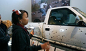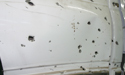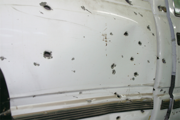 The truck was in fair condition despite all the combat fire it was subjected to. The passenger windshield had been hit and damaged by a rocket propelled grenade, and the side of the vehicle was riddled with bullet holes and shrapnel punctures. The Time Warner truck needed to be thoroughly documented and cleaned. It also needed to have the fluids removed, undergo paint stabilization, and have corrosion issues addressed prior to static museum display.